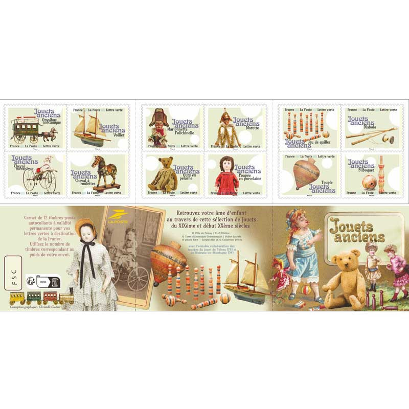 Jouets anciens. Jeux et jouets du XIXe siècle et début du XXe siècle. Timbres de France autoadhésifs N°2363 à 2374 émis en 2023. 12 valeurs neufs à validité permanente émis en carnet.