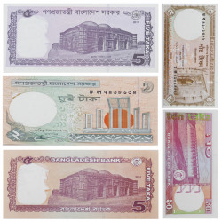 Pochette contenant 5 billets de banque neufs de Bangladesh, jamais circulés, tous différents. Etats TTB à SPL selon le code officiel.