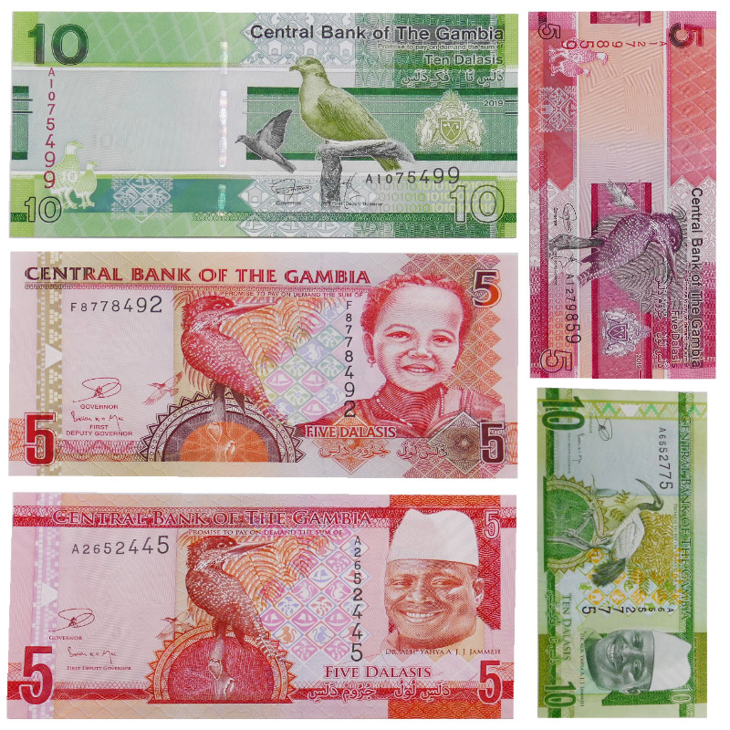 Pochette contenant 5 billets de banque neufs de Gambie, jamais circulés, tous différents. Etats TTB à SPL selon le code officiel.