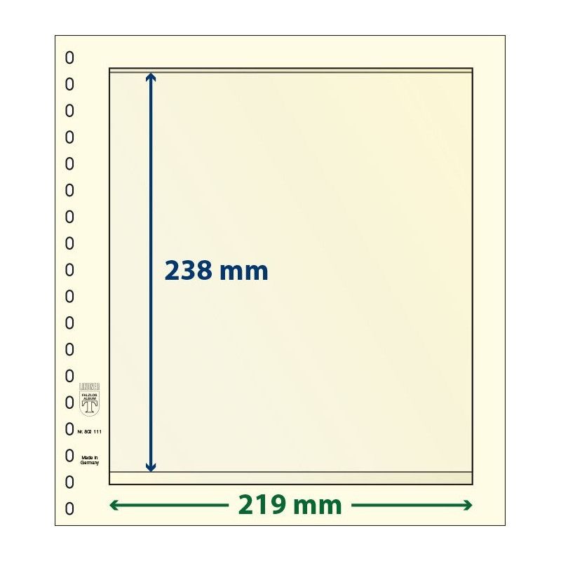 Feuille neutre Lindner-T à 1 bande pour bloc-feuillets de timbres, cartes, enveloppes, notices premier jour, photos. Modèle présenté sur la photo. Largeur de cadre élargi : 224 x 219 mm. Hauteur maximum utilisable: 238 mm. Référence Lindner: 802111. Feuilles avec 18 perforations qui s'adaptent à toutes les reliures Lindner à 18 anneaux.