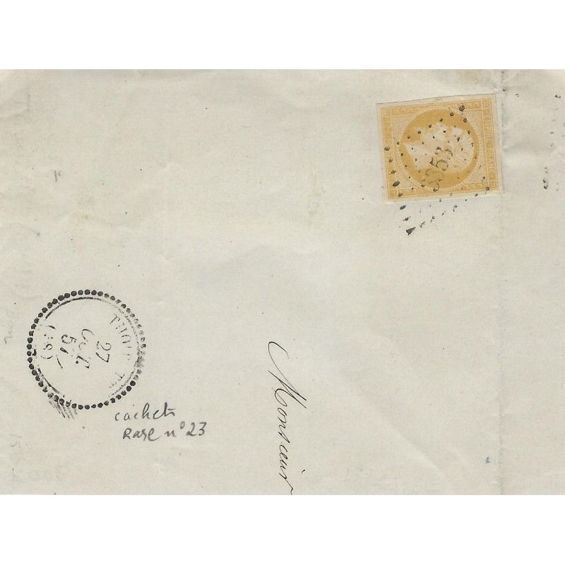 Émission Empire non dentelé 10 centimes belle nuance bistre-jaune, type I timbre de France N°13Ab oblitéré losange petits chiffres 3353 à coté de rare cachet N°23 de Thoirette (38) 27 octobre 1857 sur grand fragment.