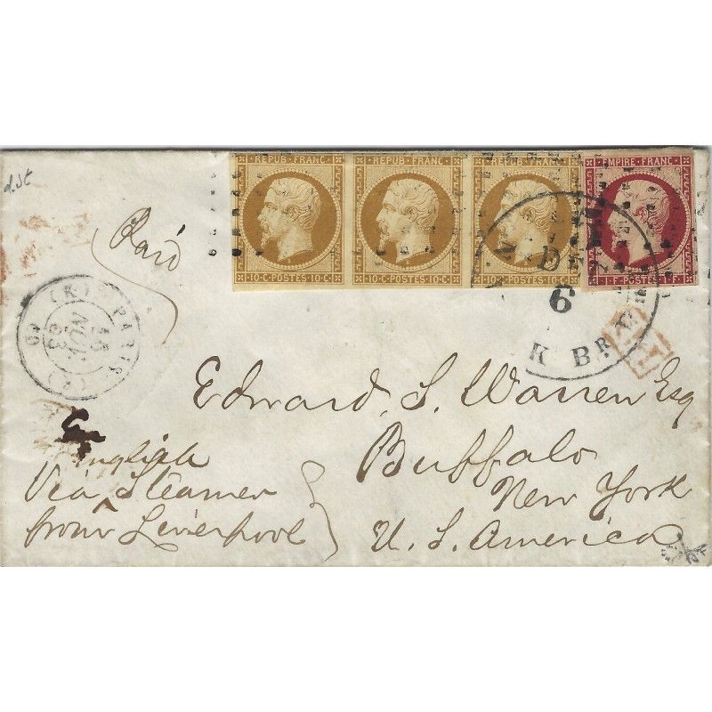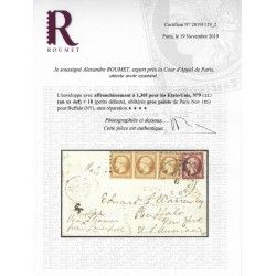 Émission Présidence timbre de France N°9 bande de 3 (1ex marge entamé) et Empire non dentelé N°18 carmin foncé (petits défauts) oblitérés gros points sur enveloppe de Paris 16 novembre 1853 pour Buffalo New York.