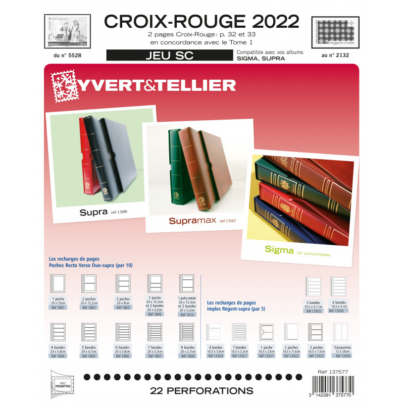 22 perforations. Compatibles avec tous les albums Supra, Supramax, Supraluxe et Sigma de marque Yvert et Tellier.