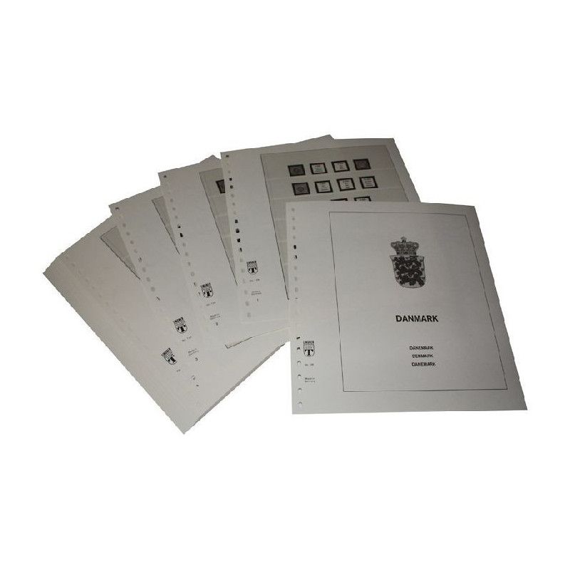 Feuilles pré imprimées Lindner-T permettant de classer les timbres de Danemark émis de 1851 à 1959. Avec Schleswig, Thuile et les Indes Danoises.