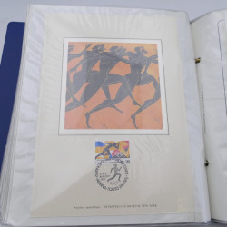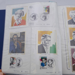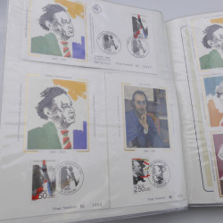 Dans un album, collection timbres commémoratifs de France oblitérés. Belles thématiques célébrités, tableaux avec cartes maximum, enveloppes d'émission et timbres oblitérés. Doubles. Très bien présentée. Excellente qualité générale.