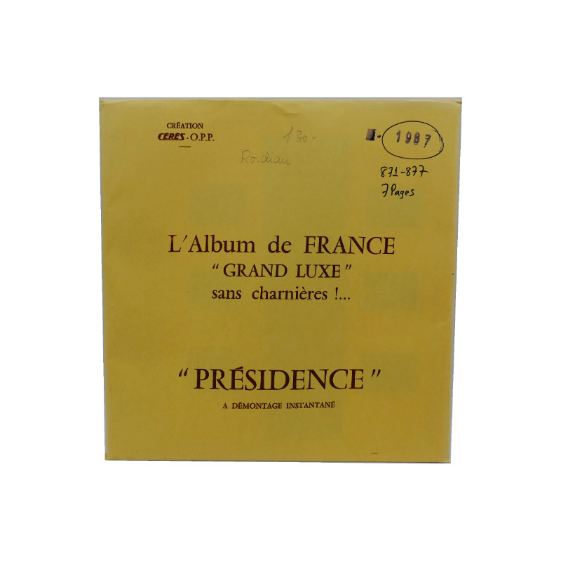 Feuilles préimprimées Cérès Présidence pour collectionner les timbres de France émis en 1987. Paquet de 7 feuilles numéros 871 à 877.