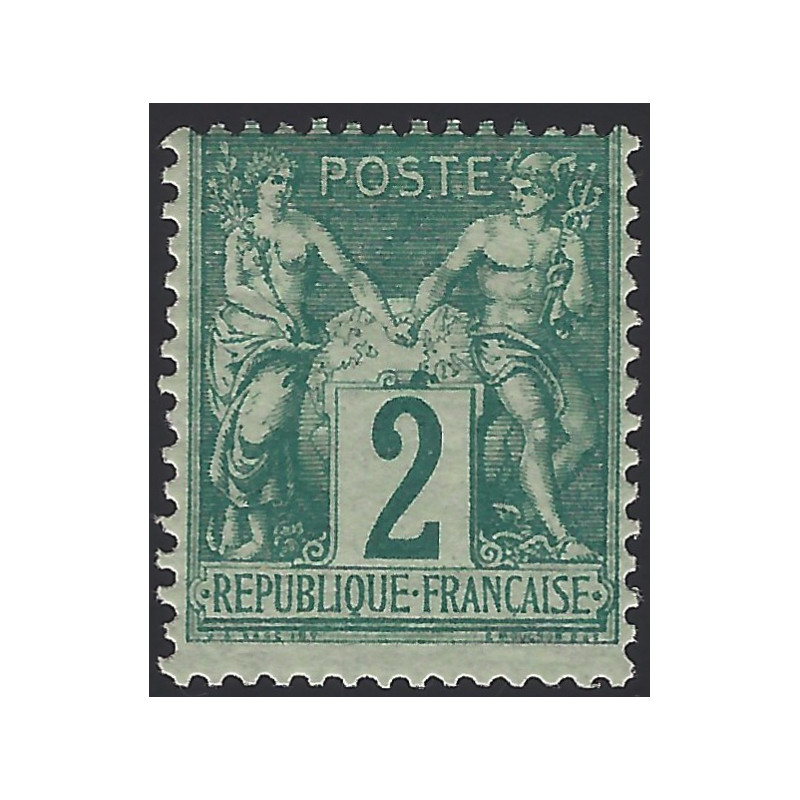 Émission dite Sage 2 centimes vert type I timbre de France émis en 1876. Numéro Yvert : 62 neuf* gomme d'origine avec infime trace, quasi** très frais. Rare. Cote 1800 €. Signé Brun. Certificat Roumet.