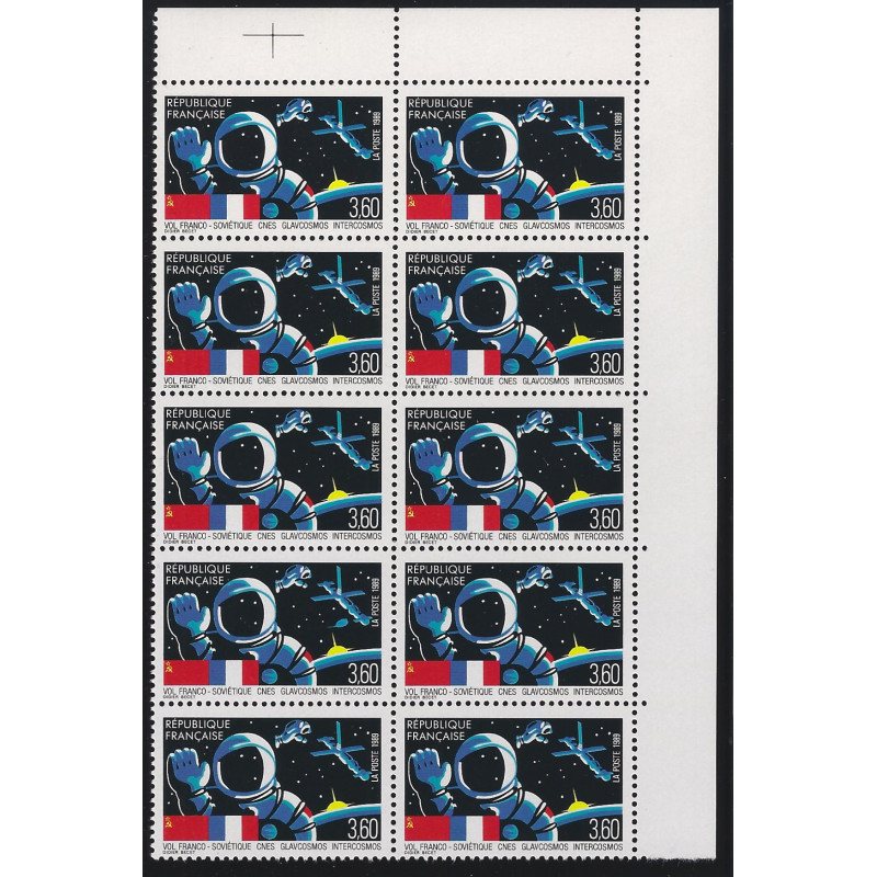 Vol franco-soviétique "C.N.E.S. - Glavcosmos Intercosmos", Cosmonaute timbre de France émis en 1989. Variété grosse bulle bleue dans un bloc de 10 tenant à 5 normaux (4ème timbre de gauche). Numéro Yvert : 2571b Neuf** gomme d'origine intacte. Cote variété seule : 80 €.