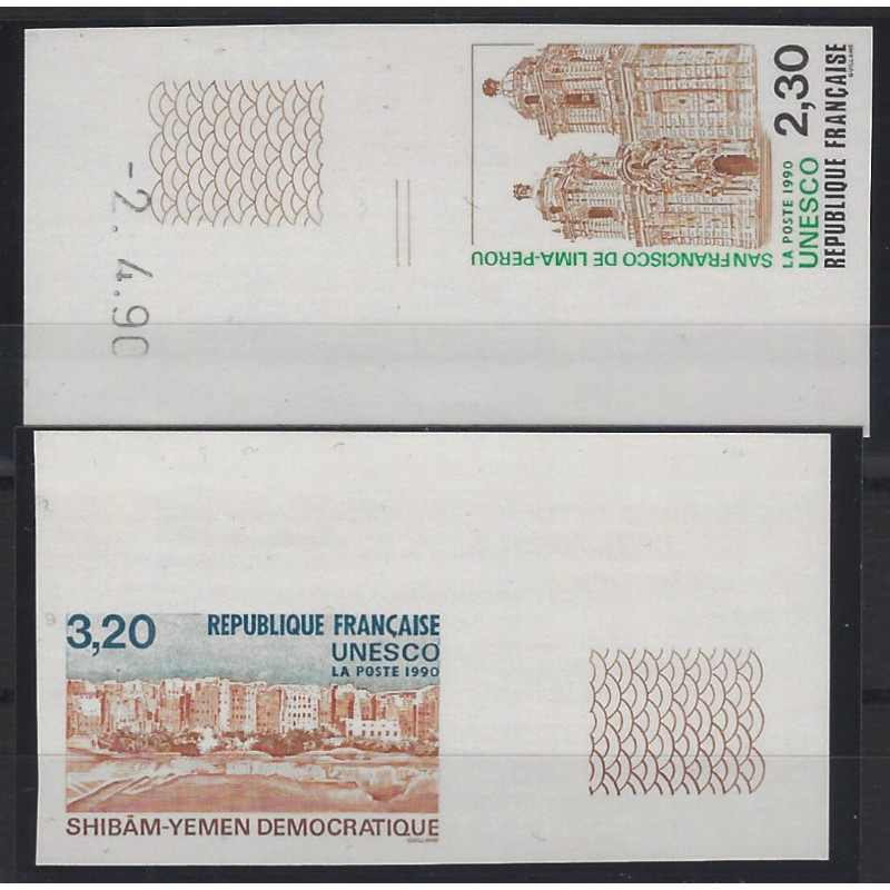 U.N.E.S.C.O. Patrimoine universel. Sites classés à protéger, timbres de service de France émis en 1990. Numéros Yvert 102-103 série de 2 valeurs non dentelé neufs** gomme d'origine intacte.