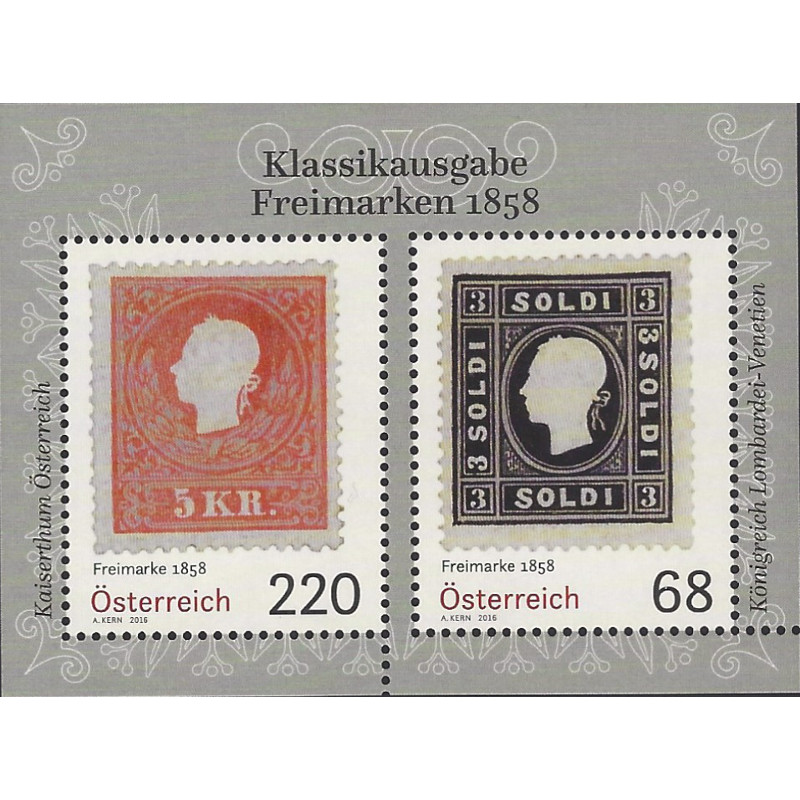 La philatélie. Timbres classiques de 1858. Feuillet de 2 timbres d'Autriche émis en 2016. Numéro Yvert : F3118 neuf** gomme d'origine intacte. Emis uniquement en feuillet.