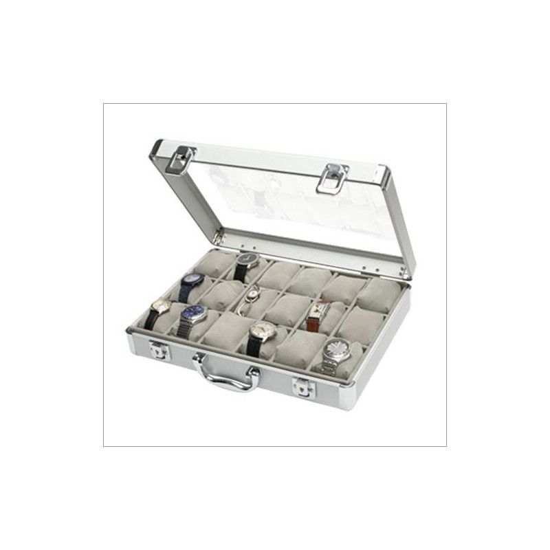 Avec 18 coussins recouverts de velours gris pour attacher les montres de toutes tailles. Couvercle transparent en plexiglass.